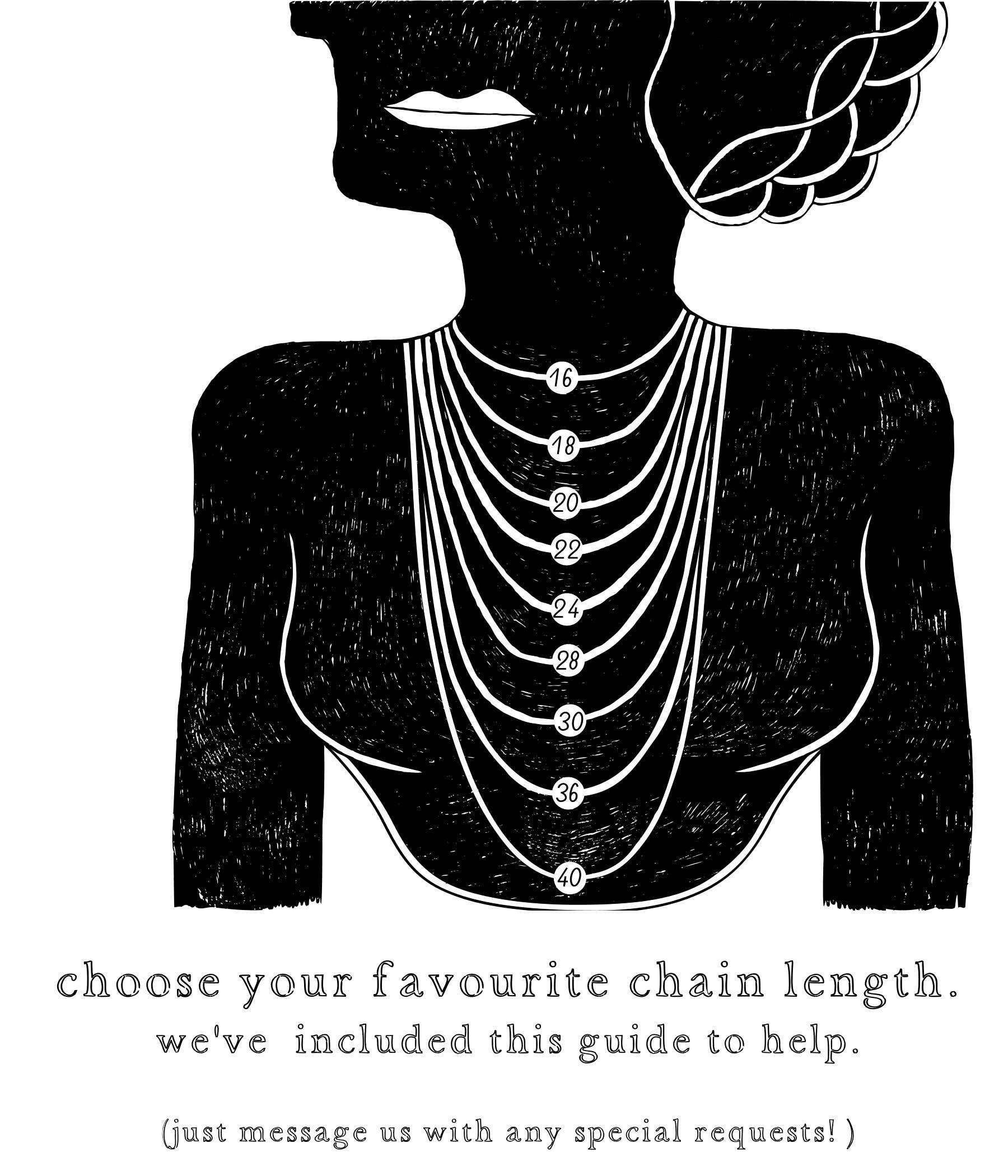 The chain is made from gold plated brass and comes in a choice of different lengths. Please refer to our illustration for a better idea of how necklace lengths will look.