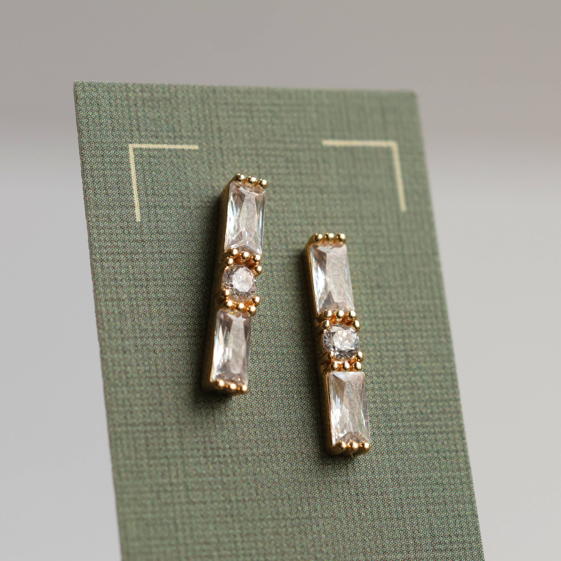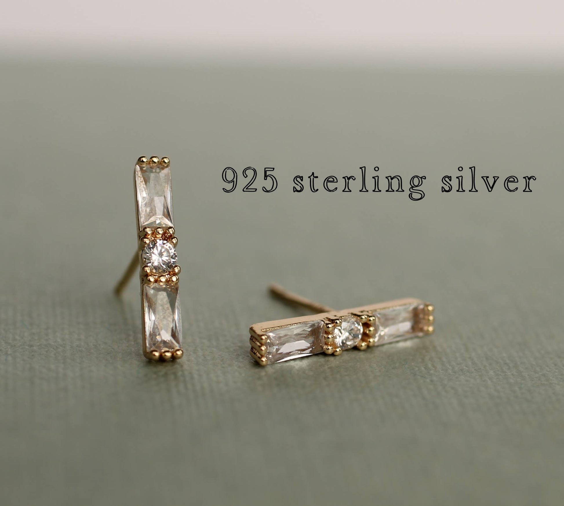 These beautifully made stud earrings feature two baguette stones, set into crown detailed settings. The settings are posts are made from gold plated 925 sterling silver.