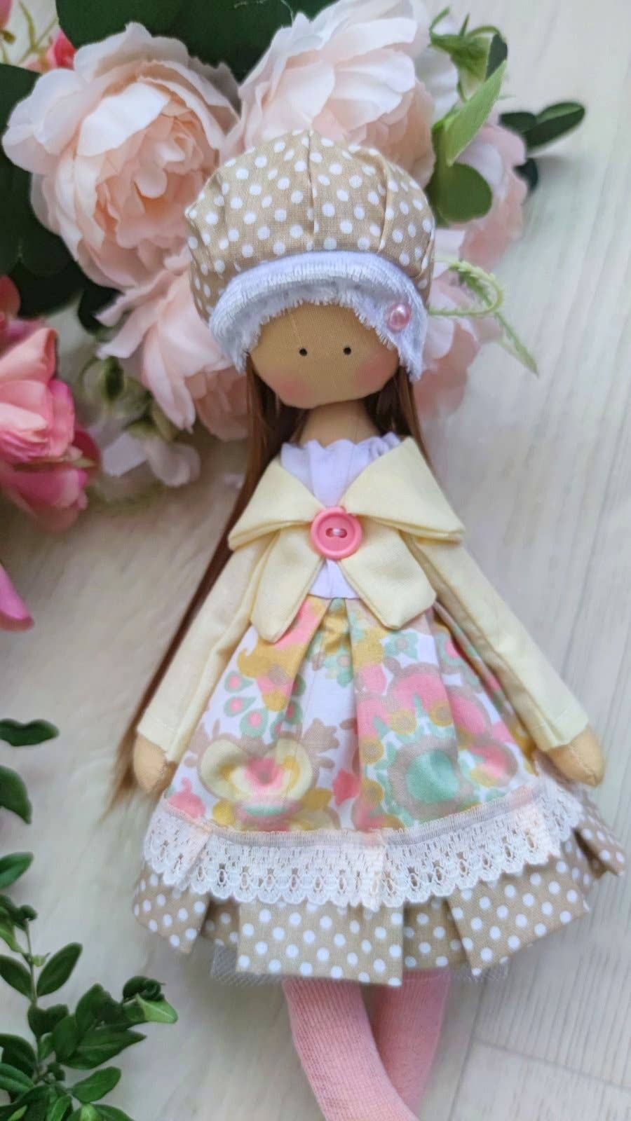 A doll that you cannot find anywhere, with a perfect finish and is very sweet. She is a really delightful doll that wants to move into your home as soon as possible! This doll will be a very good friend for girls and will bring a lot of sunshine and happiness to your home! We hope you'll fall in love with her. Made with love of 100% cotton new fabrics and stuffed with non-allergenic polyester fiber in a smoke free home. - Size : 25 cm (9 inch ) - Material: Cotton, Decorative elements, Cotton Lace, - How to Care: Dry clean (Not washable) Suitable for children over 5 years, Clothes are not removable. The doll has small elements (decorative elements, buttons, beads) .