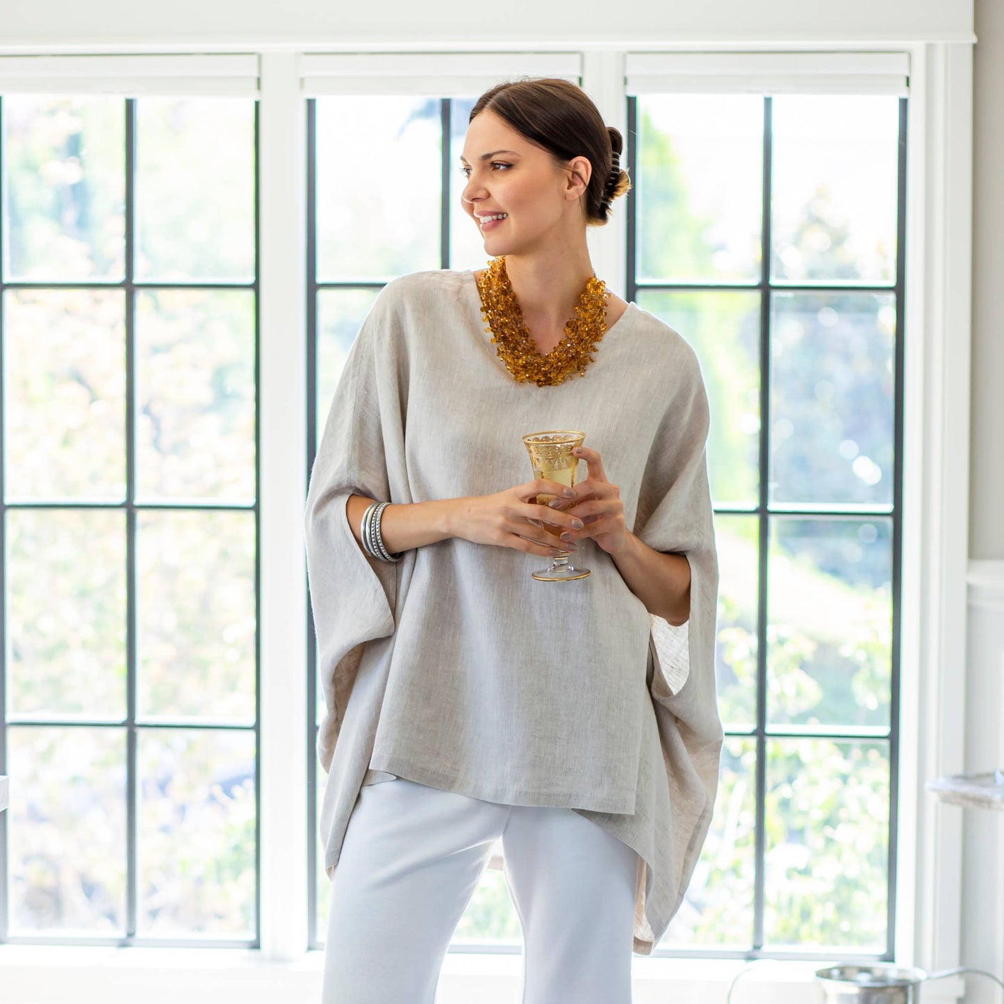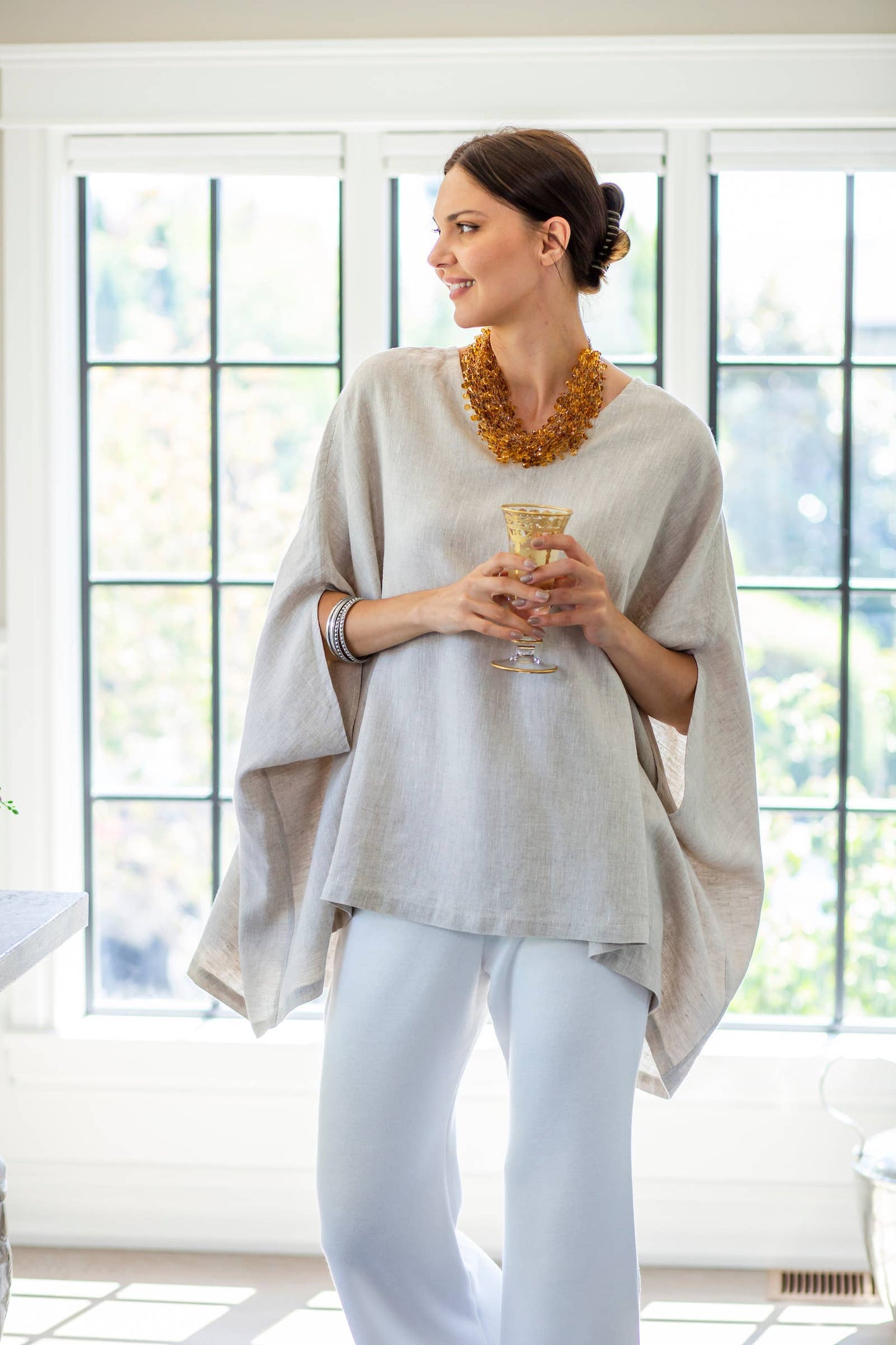One size fits all, short v-neck poncho. Looks great over a cami or blouse. Moderate weight linen, with a bit more weight than our Juliet Poncho, perfect for any time of year!!