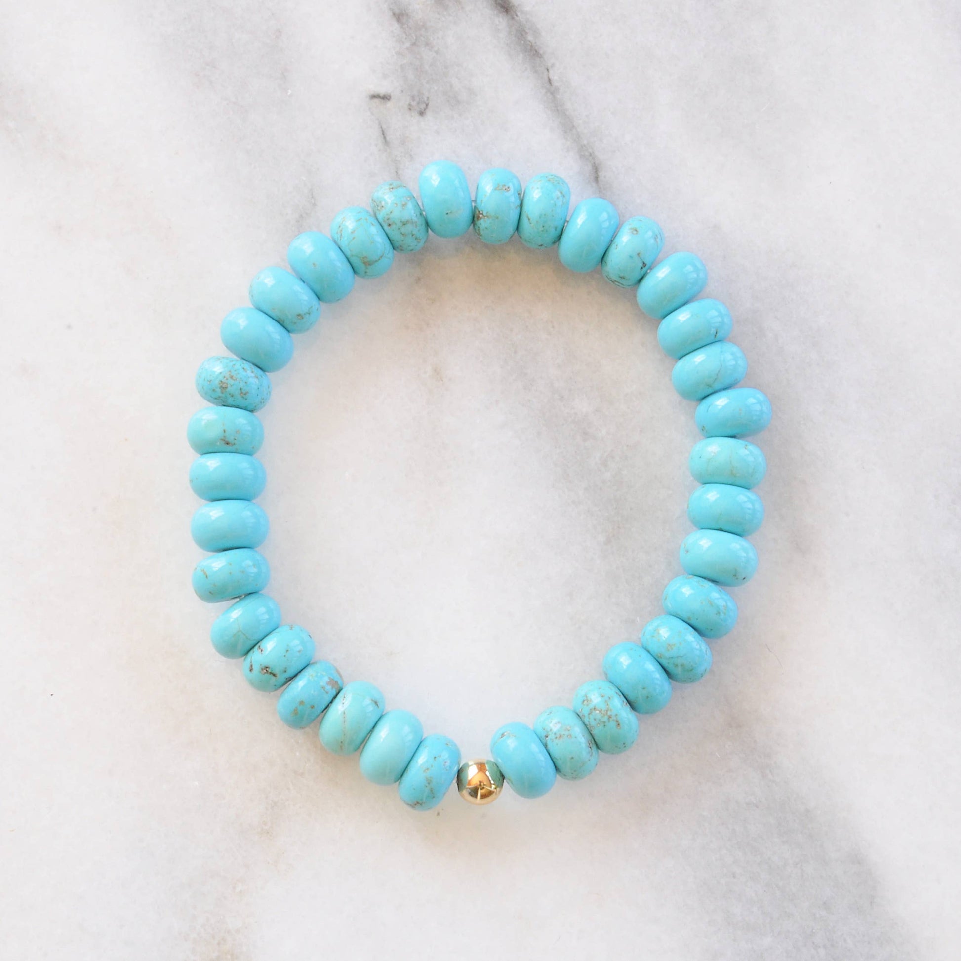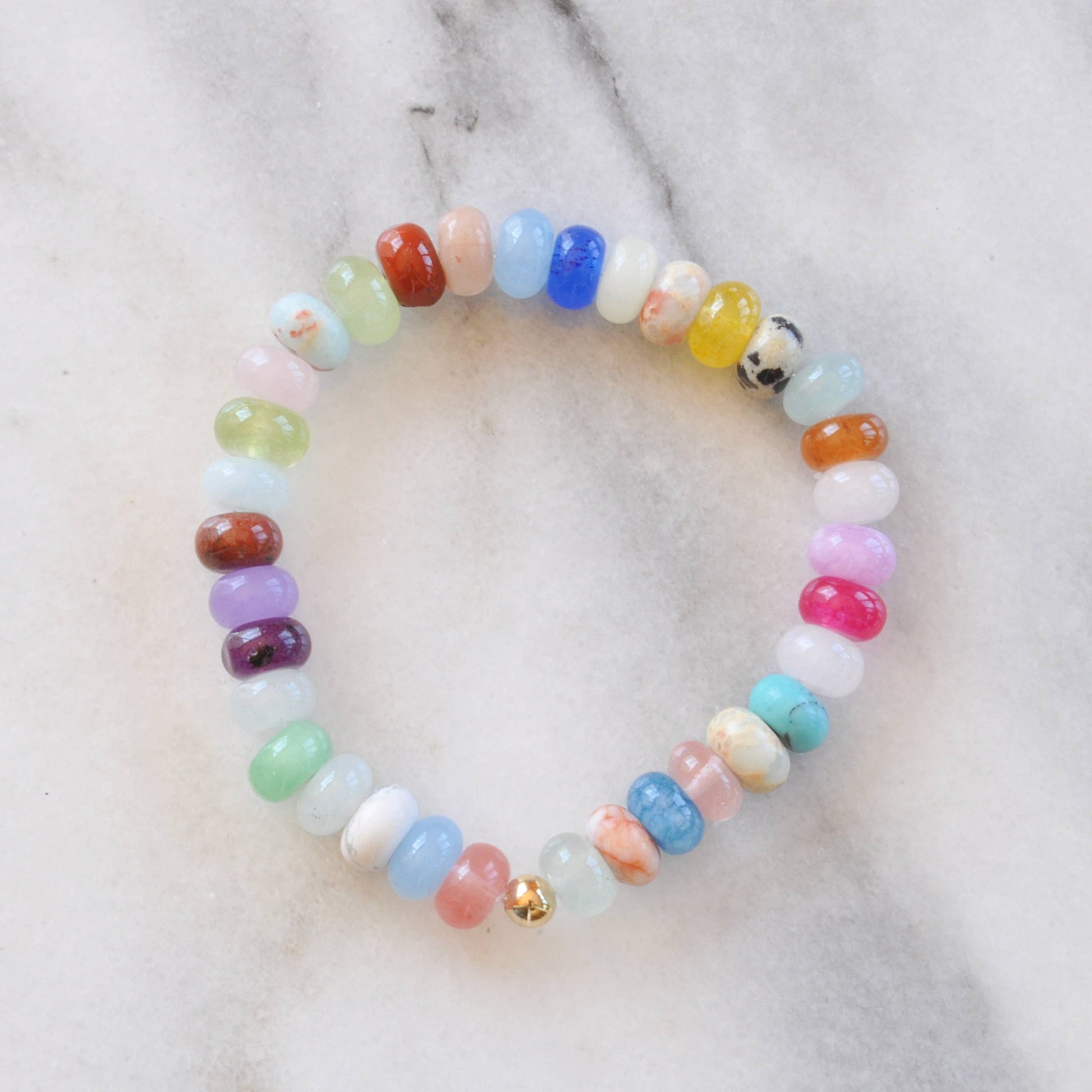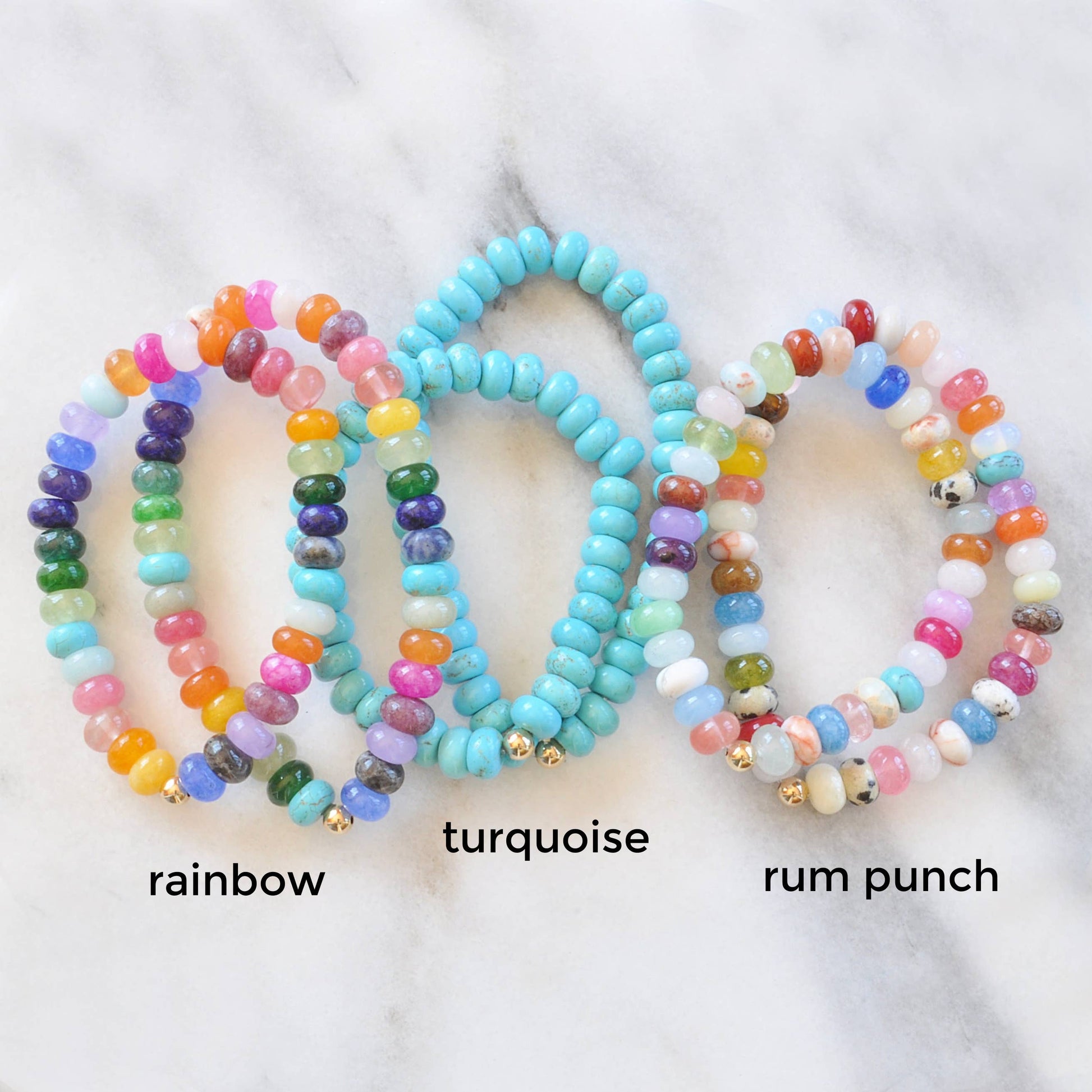 + Thick, smooth 5x8mm rondelle gemstone beads come in three options: Rainbow, Turquoise, or Rum Punch (a random mix of gems - every bracelet is different)