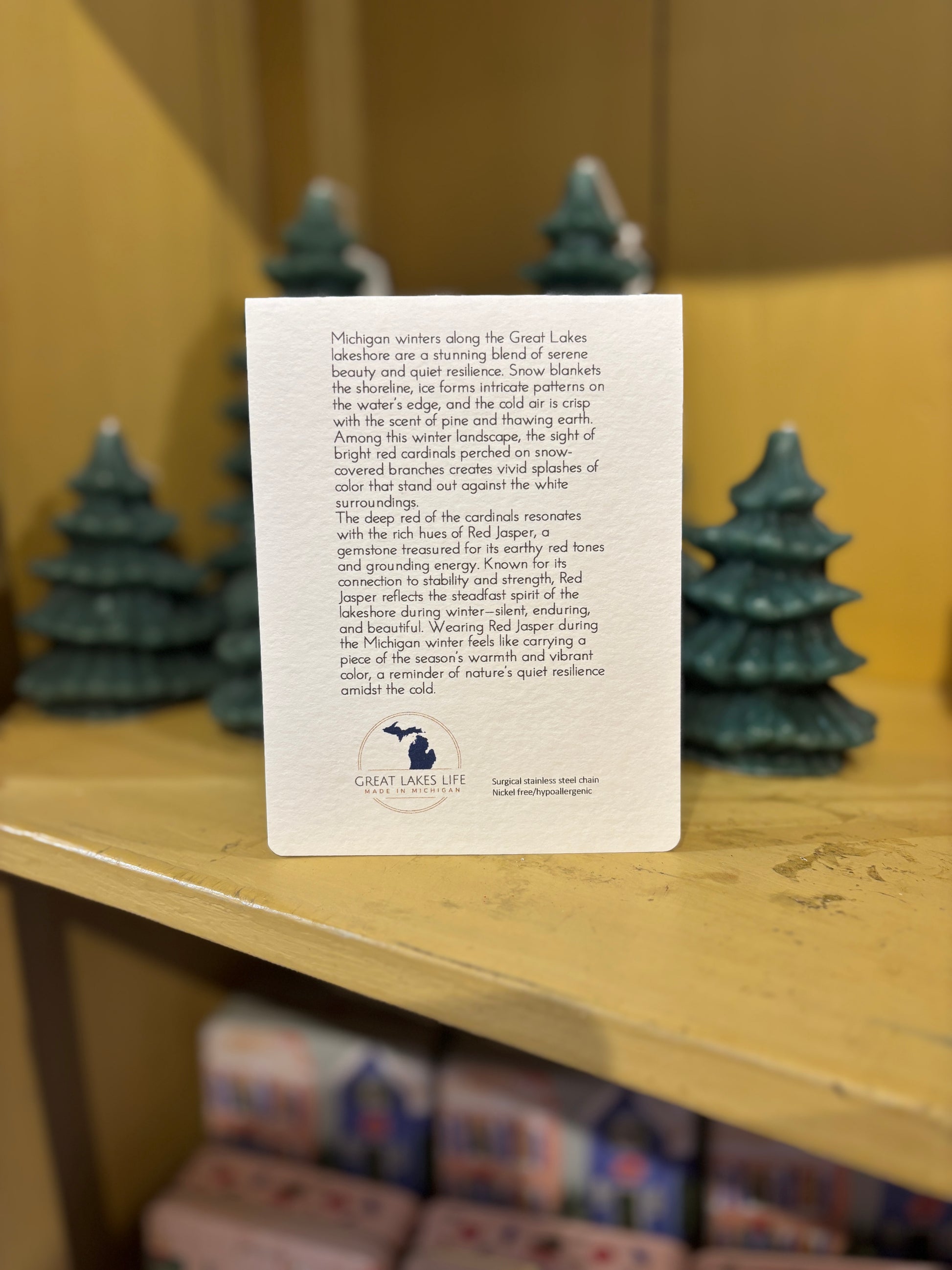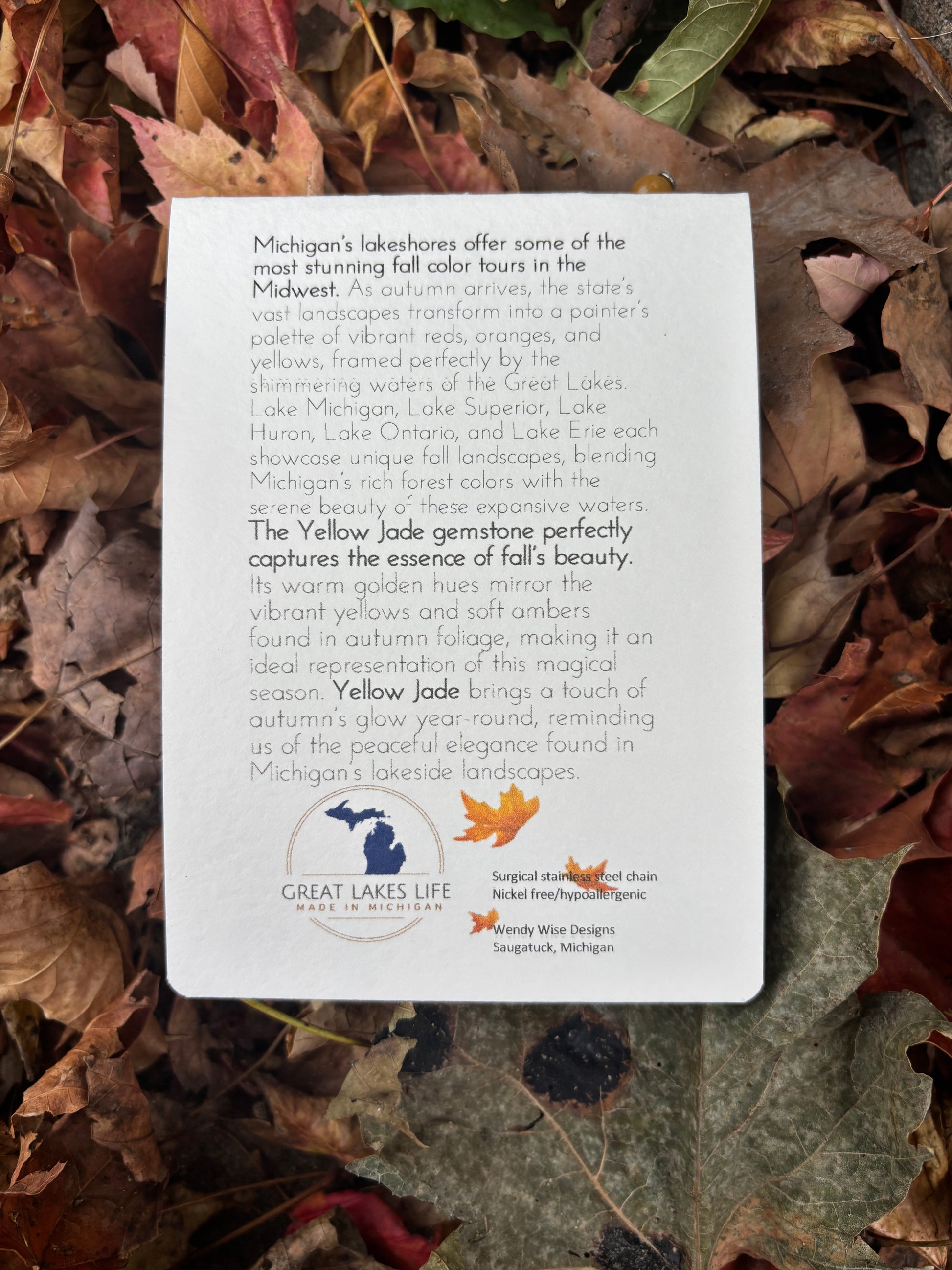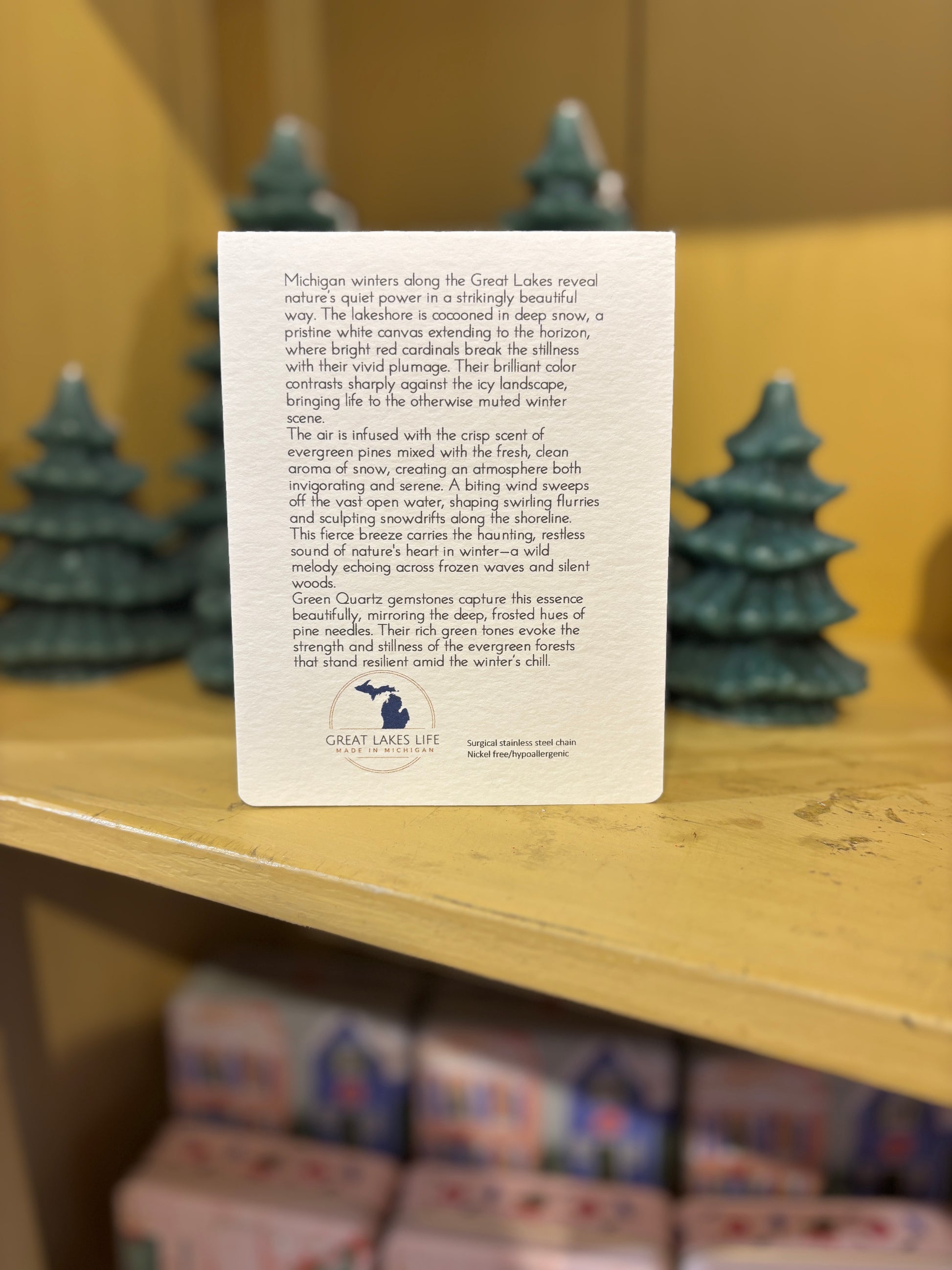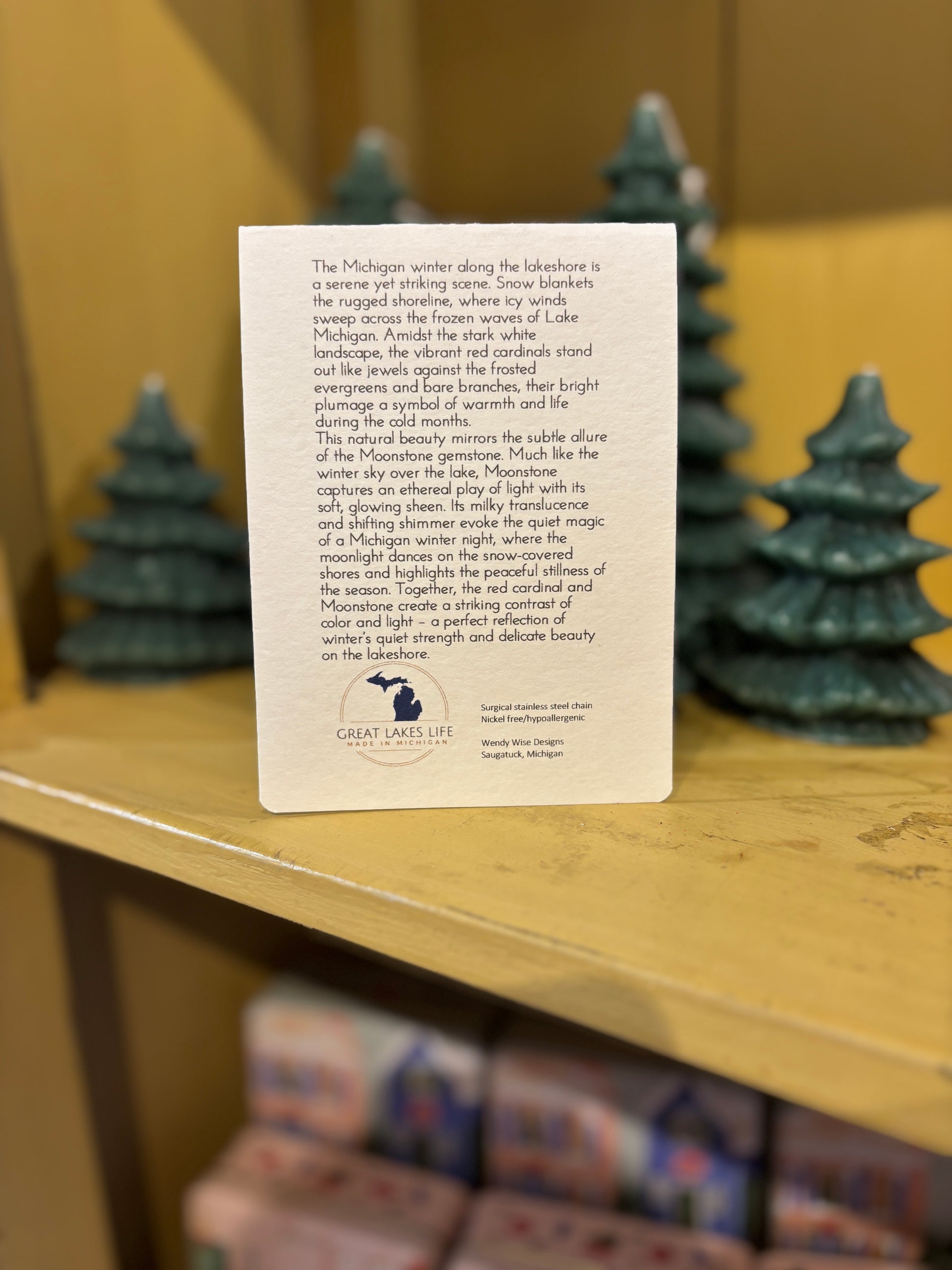 These amazing necklaces hold a unique story of Michigan's rich history. Take a piece of the Great Lakes home with you in this enchanting, locally made piece. Wendy, the creator is from Saugatuck, Michigan, right down the road from Leelanau County. We are SO grateful to carry her brand. Each piece is crowned with a crystal or stone that embodies a distinct chapter of our history, elegantly conveyed through exquisite packaging. This thoughtful detail elevates it to a truly remarkable gift.