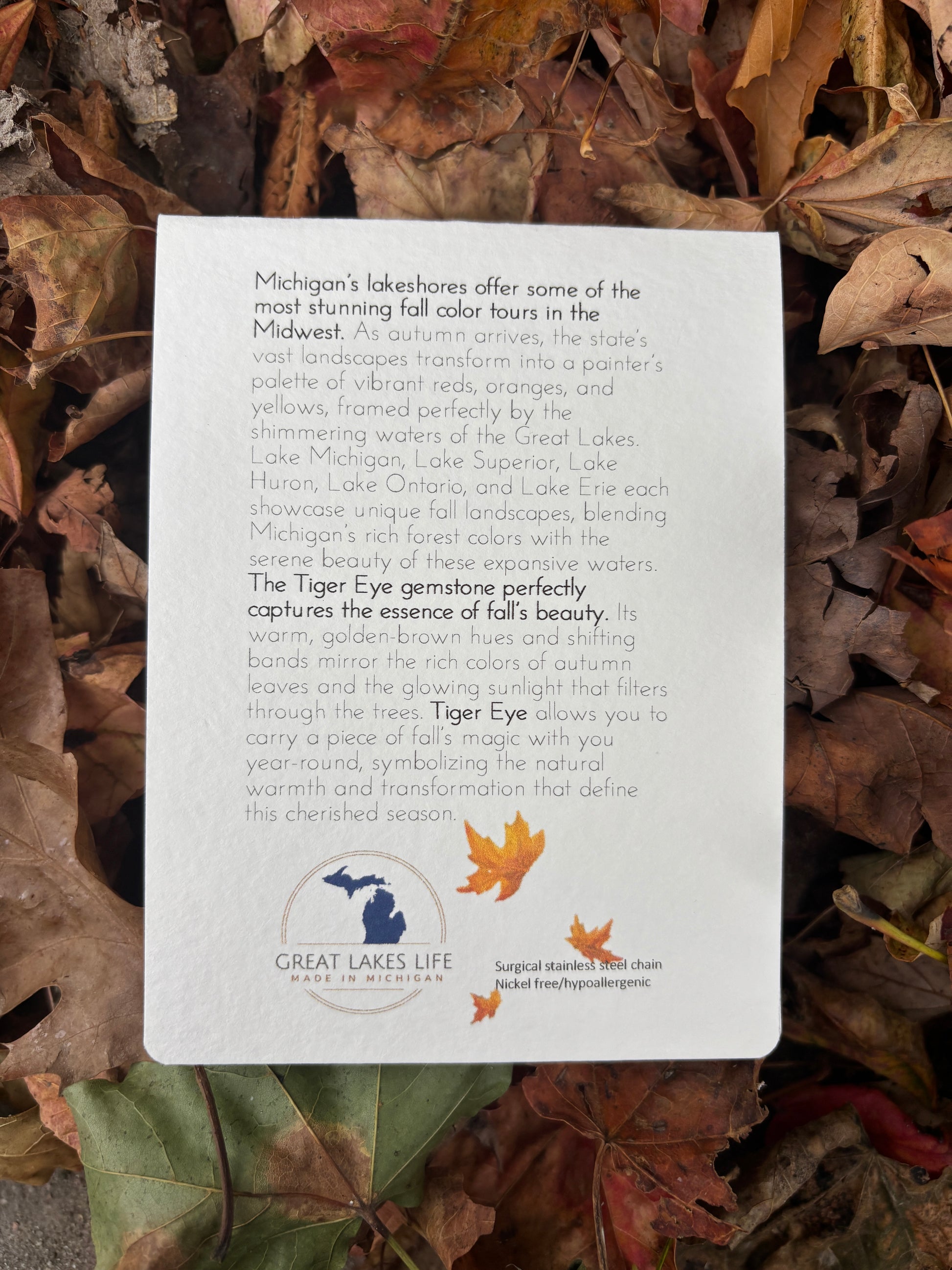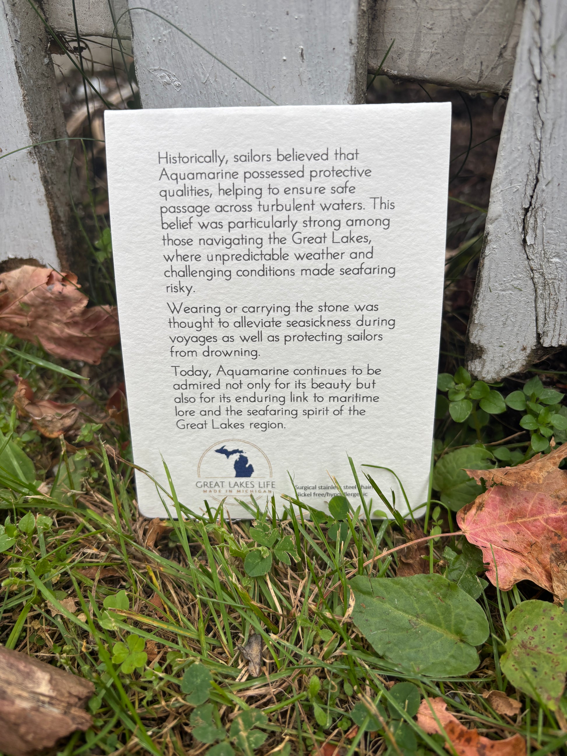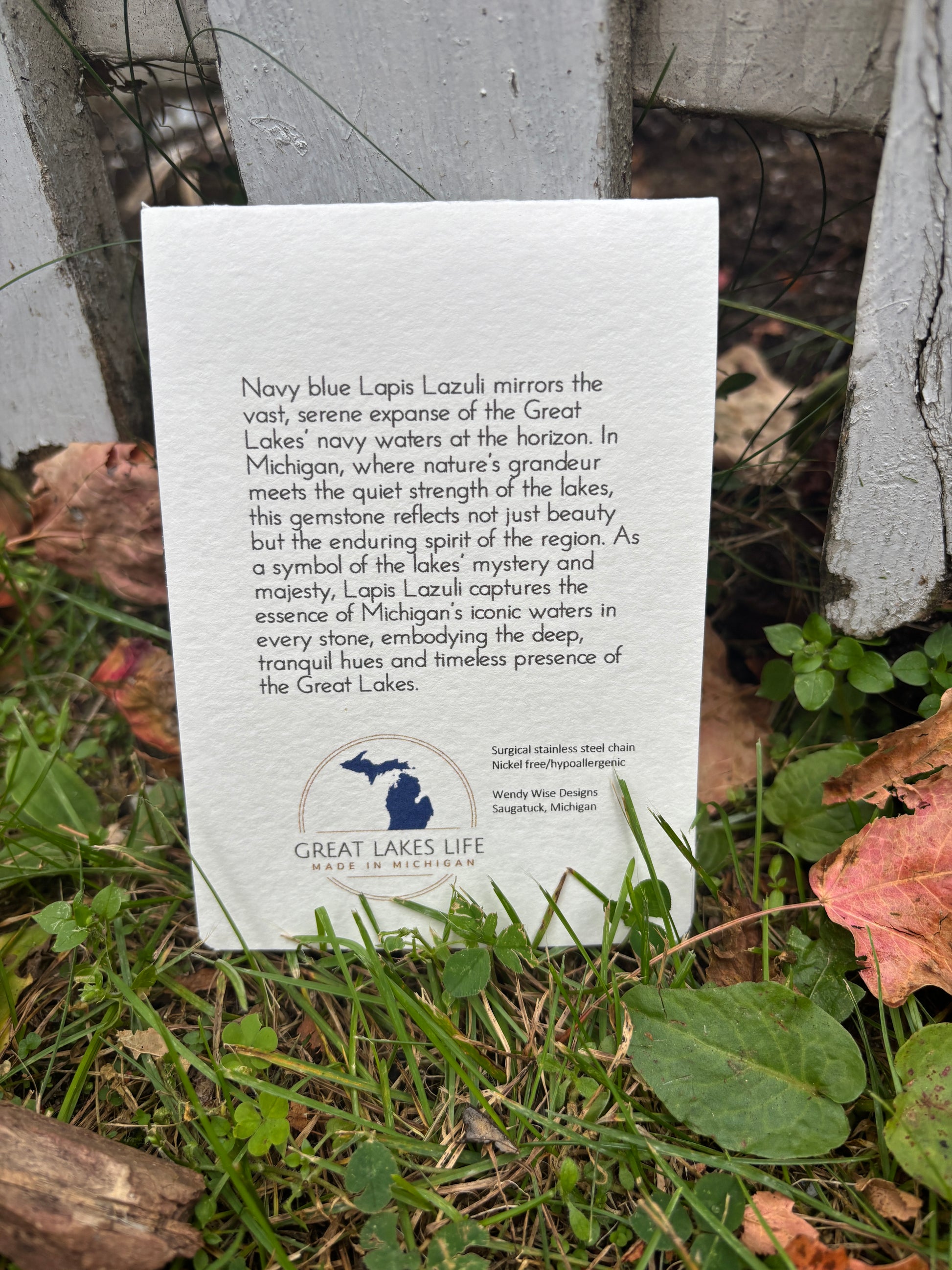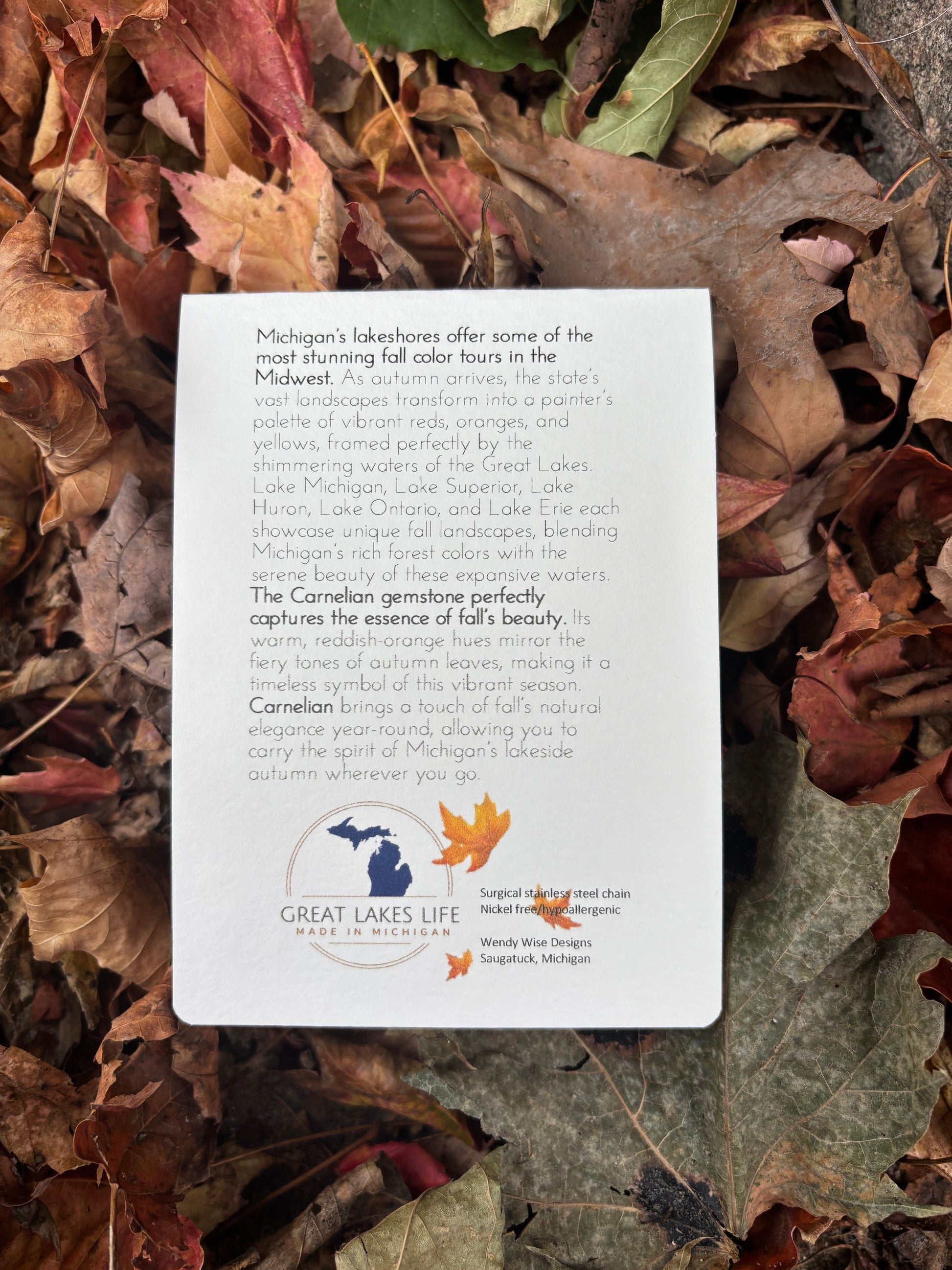These amazing necklaces hold a unique story of Michigan's rich history. Take a piece of the Great Lakes home with you in this enchanting, locally made piece. Wendy, the creator is from Saugatuck, Michigan, right down the road from Leelanau County. We are SO grateful to carry her brand. Each piece is crowned with a crystal or stone that embodies a distinct chapter of our history, elegantly conveyed through exquisite packaging. This thoughtful detail elevates it to a truly remarkable gift.