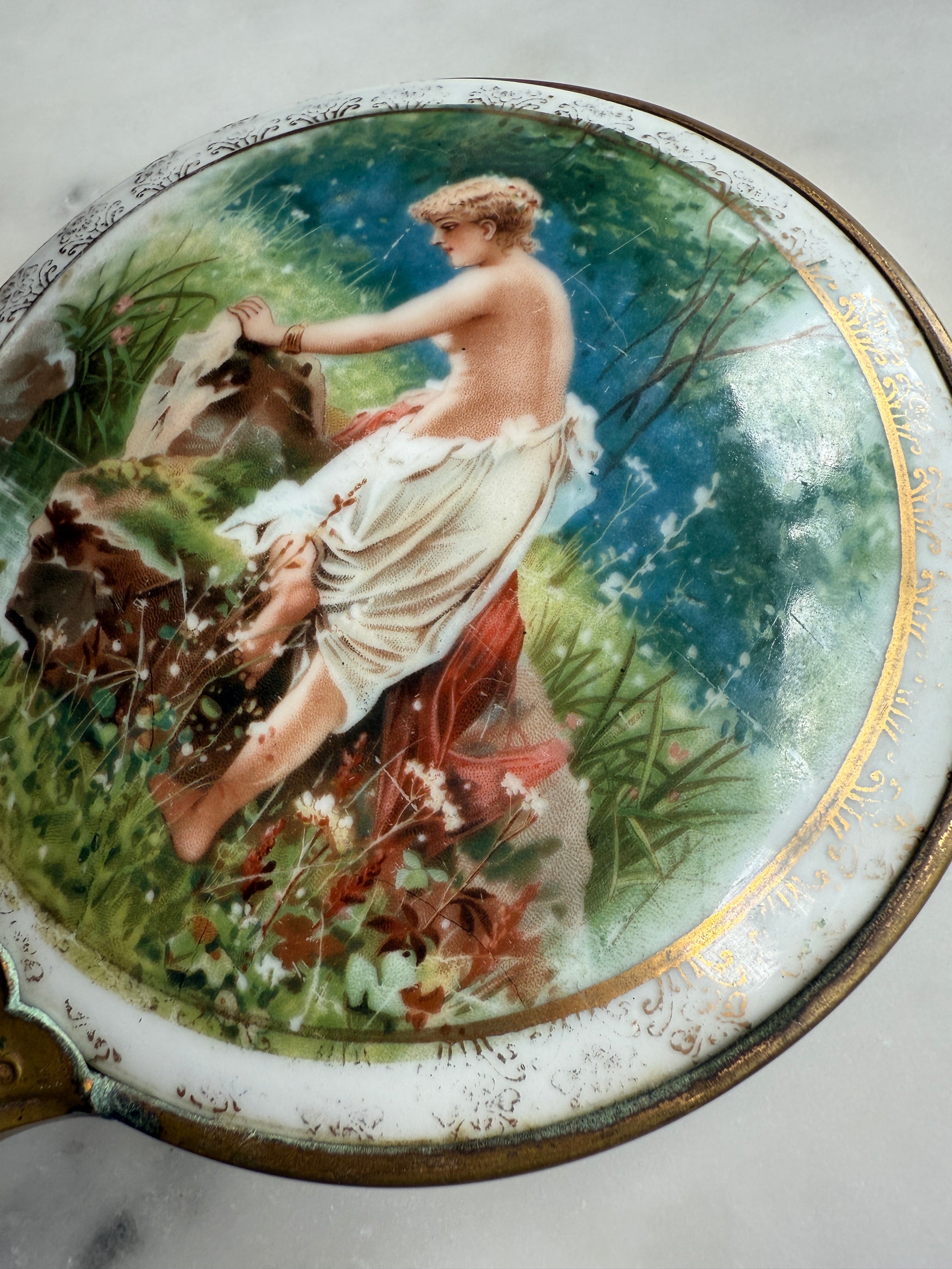 Decorative Inserts: The most striking feature is the hand-painted or highly detailed transferware scenes on the back of the mirror and brush. They depict a classical or mythological figure (possibly a nymph or goddess) in a natural landscape setting with flowing water. The brush insert is oval, and the mirror insert is round. Both have the same image making this a matching set. The details on the porcelain inserts, including the delicate gold accents around the edges, add to their beauty and value.