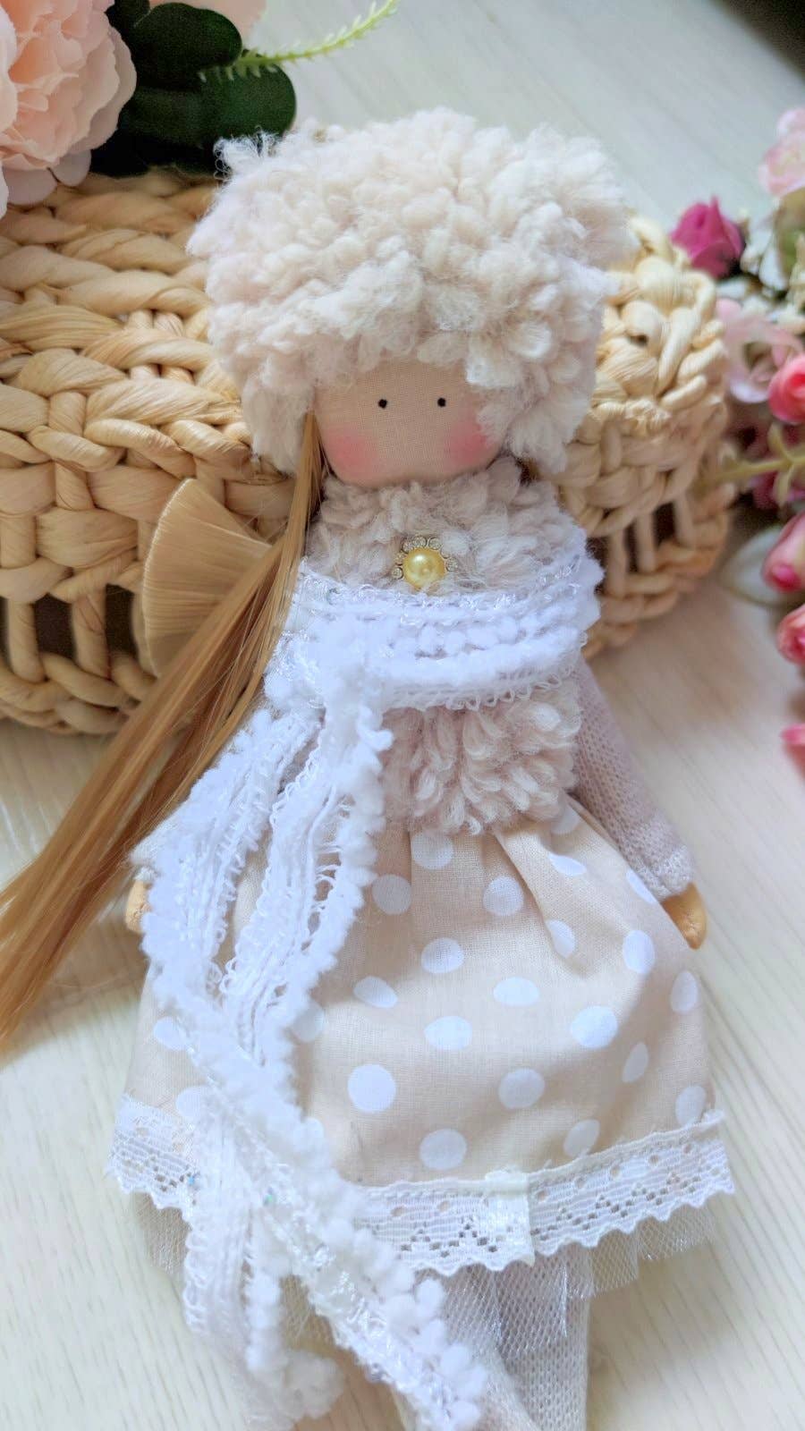 A doll that you cannot find anywhere, with a perfect finish and is very sweet. She is a really delightful doll that wants to move into your home as soon as possible! This doll will be a very good friend for girls and will bring a lot of sunshine and happiness to your home! We hope you'll fall in love with her. Made with love of 100% cotton new fabrics and stuffed with non-allergenic polyester fiber in a smoke free home. - Size : 25 cm (9 inch ) - Material: Cotton, Decorative elements, Cotton Lace, -- How to Care: Dry clean (Not washable) Suitable for children over 5 years, Clothes are not removable. The doll has small elements (decorative elements, buttons, beads) .