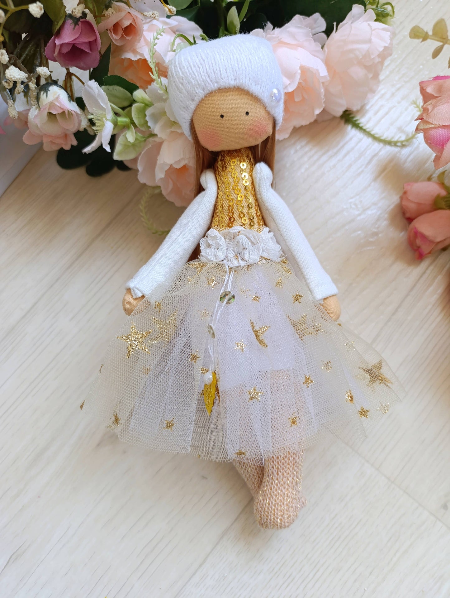 A doll that you cannot find anywhere, with a perfect finish and is very sweet. She is a really delightful doll that wants to move into your home as soon as possible! This doll will be a very good friend for girls and will bring a lot of sunshine and happiness to your home! We hope you'll fall in love with her. Made with love of 100% cotton new fabrics and stuffed with non-allergenic polyester fiber in a smoke free home. - Size : 25 cm (9 inch ) - Material: Cotton, Decorative elements, Cotton Lace, - How to Care: Dry clean (Not washable) Suitable for children over 5 years, Clothes are not removable. The doll has small elements (decorative elements, buttons, beads) .