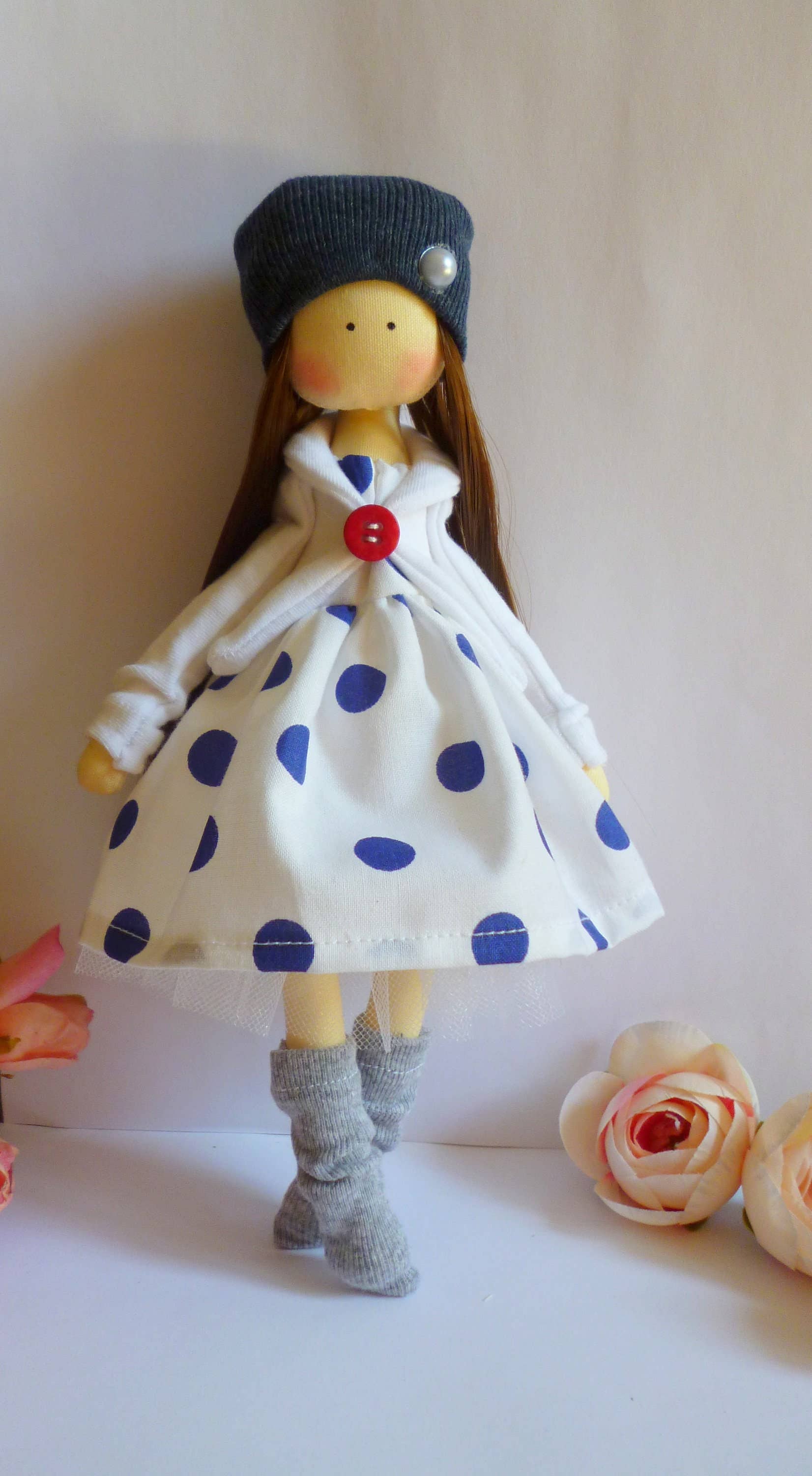 Delicate and gentle this doll can be beautiful home decoration, nursery decoration, nice gift for any occasion. Made with love from 100% cotton new fabrics and stuffed with non-allergenic polyester fiber in a smoke free home. You can put doll on a shelf or dresser for interior decoration. Height dolls 25 cm Material: Cotton, Decorative elements, Cotton Lace, - How to Care: Dry clean (Not washable) Suitable for children over 5 years, Clothes are not removable. The doll has small elements (decorative elements, buttons, beads) . If you are buying a doll for a child under 5 years old, the child must play under supervision. I can make a doll without small decorative elements.