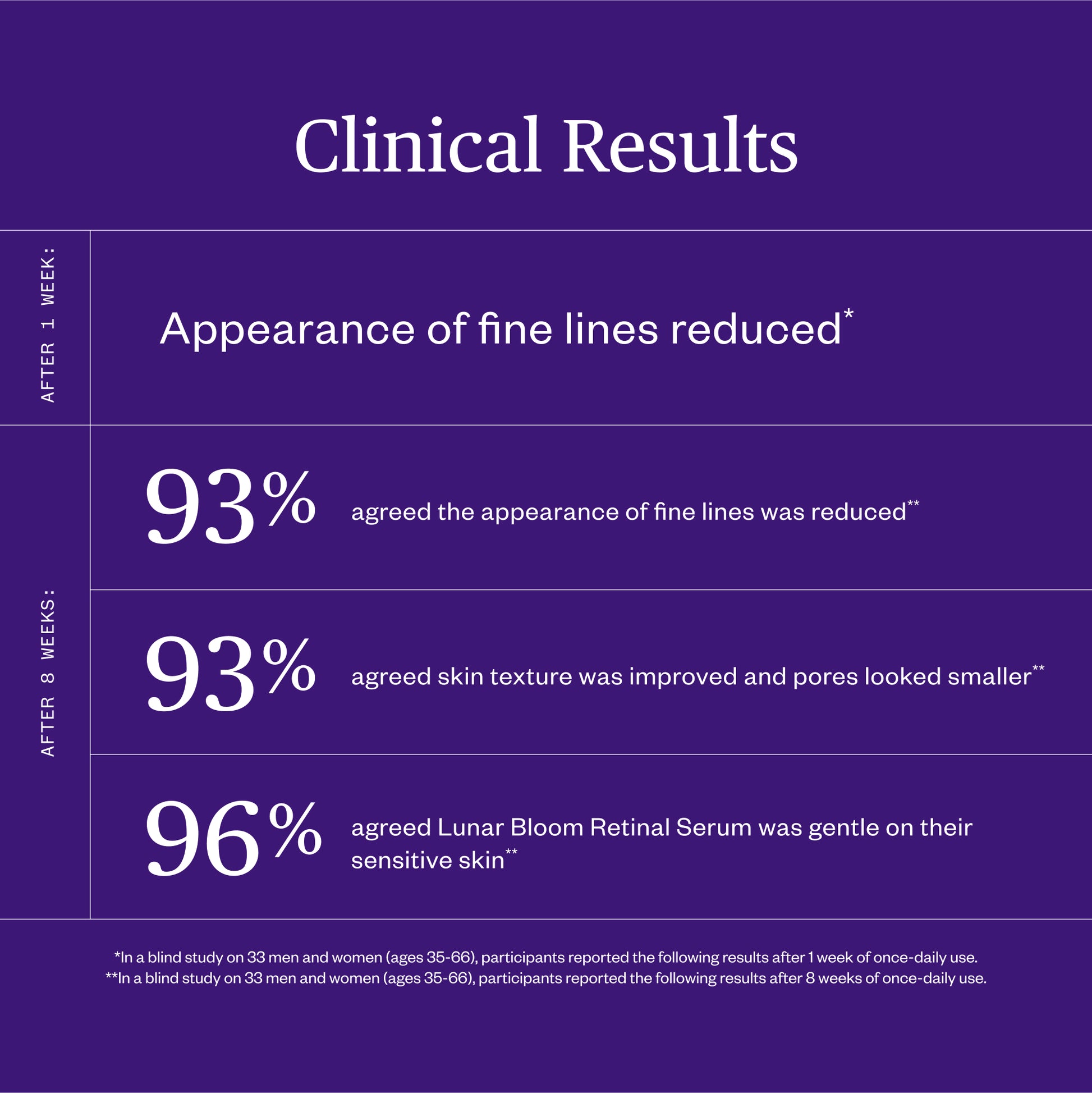Powered by Retinal—a skin-supercharging vitamin A derivative—plus micronutrient-rich forest actives and night-blooming flowers. Lunar Bloom Retinal Serum is a potent yet gentle ritual for evening skin texture and smoothing the appearance of fine lines.