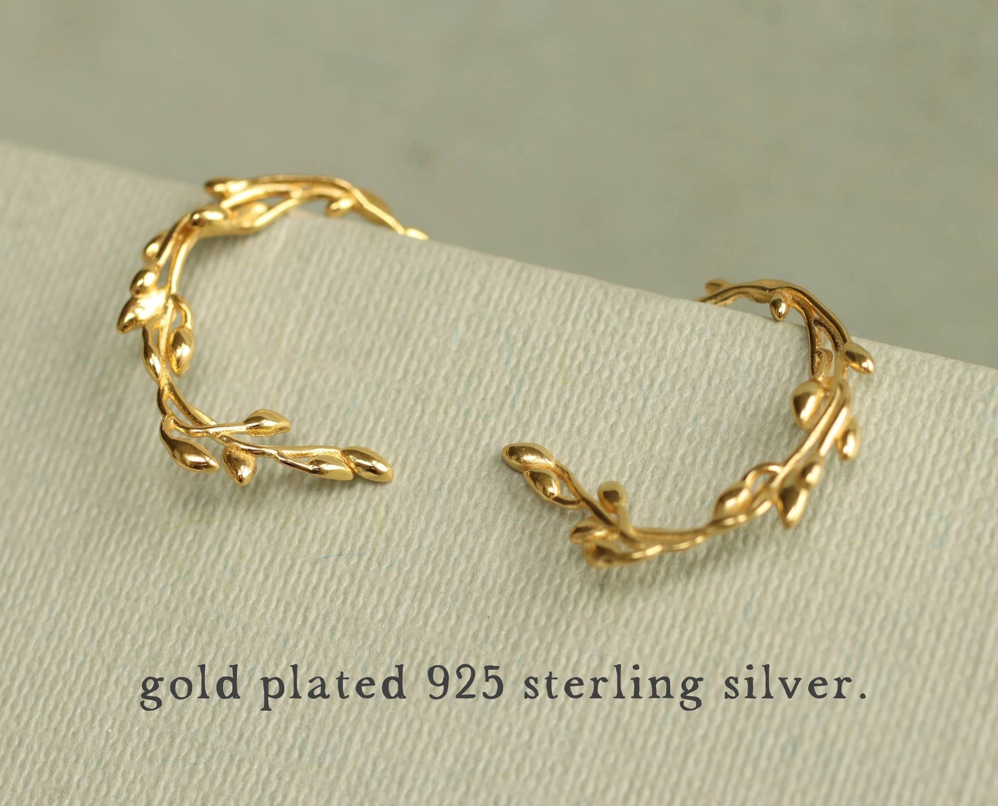 These charming hoop earrings are made from gold plated sterling silver. They feature a series of intertwined leaves, to form a circular olive branch design.