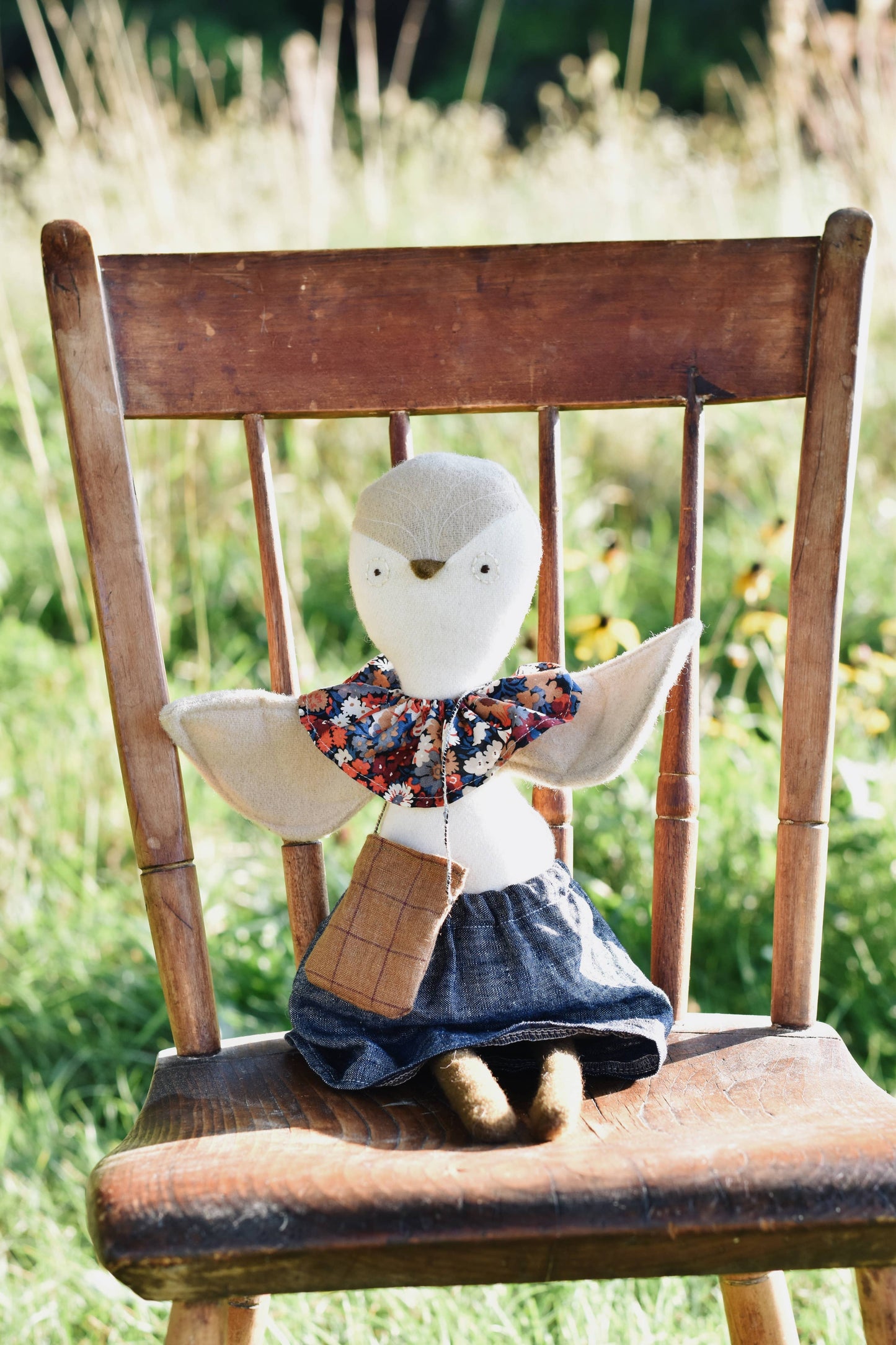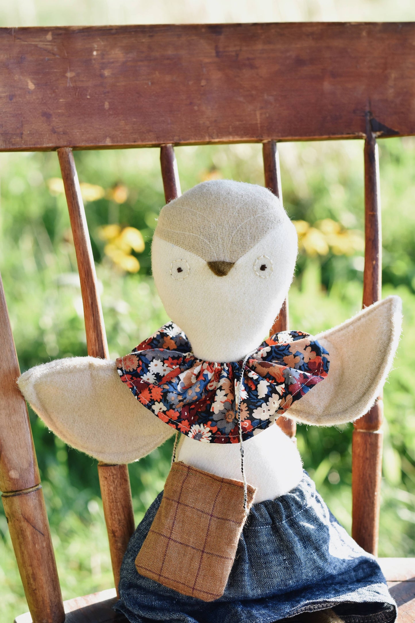 The perfect stuffed owl doll. Our soft and plush woolen animals are handcrafted using 100% natural fibers sourced from American farms. They're durable, safe and eco-friendly! Each heirloom quality animal is designed to be loved for generations. Olive is wearing her with a liberty print collar with a chambray skirt. She also arrives with a cross body satchel. Handmade: Overlooking the open fields from the loft of her home, Camie makes each animal in her collection entirely by hand. Inspired by the authenticity of the Amish way, she creates her animals in a minimalist, simplistic style that lends an heirloom quality to each one. Size: petite-14 inches tall Materials: 100 % Australian Merino Wool Organic Wool Filling from sheep in Pennsylvania Cotton Poplin Linen Each doll is unique and may vary slightly from the photographs.
