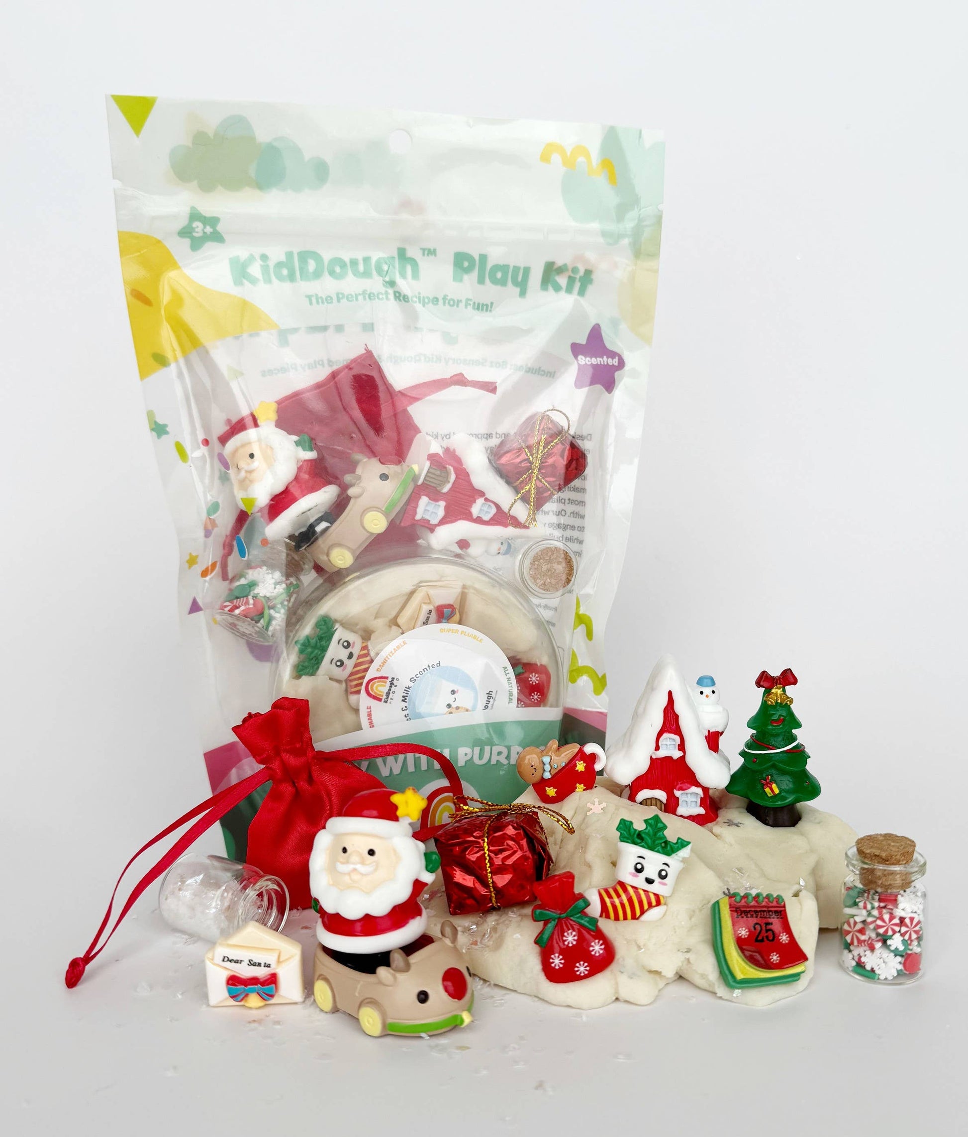 Includes: 8 oz White (Milk & Cookies) KidDough with Cozy North Pole Charms Inside, Santa, Santa's Cottage and Christmas Tree Figurine, Reindeer Go Kart for Santa to Zoom Around the North Pole, Santa's Bag, Present, Jar with Faux Snow and Jar with Swirly Peppermints and Snowflakes