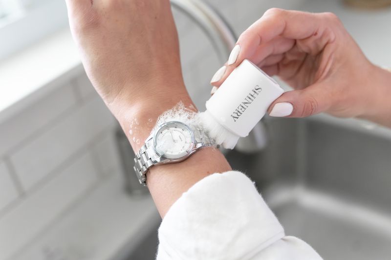 Lightly water brush under sink and apply the Radiance Wash directly on the bristles. Gently scrub your jewelry, producing a thick lather. Rinse the jewelry and brush with water and pat jewelry dry with a soft cloth.