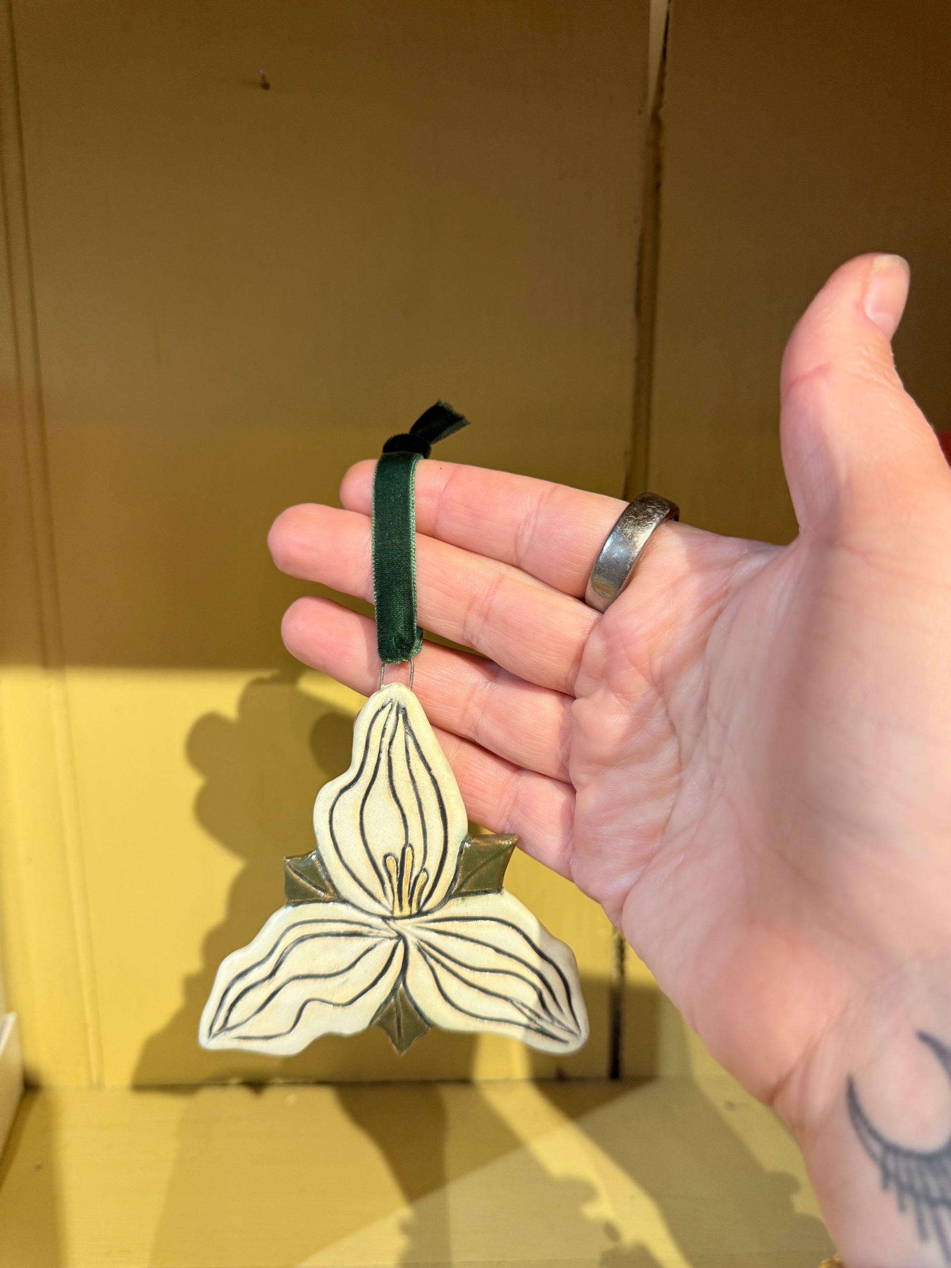 Bring home a piece of art from Megan Stoeckel, a visionary potter from Cedar dedicated to her craft. Each Trillium hanger emerges from her hands as a unique work of art—meticulously shaped, individually painted, and born of creative passion. The Trillium is beloved as it lines our forest floors in the spring. When you display one of these pieces, you're not just decorating—you're celebrating the soul of local artisanship and supporting a talented woman artist in our community.