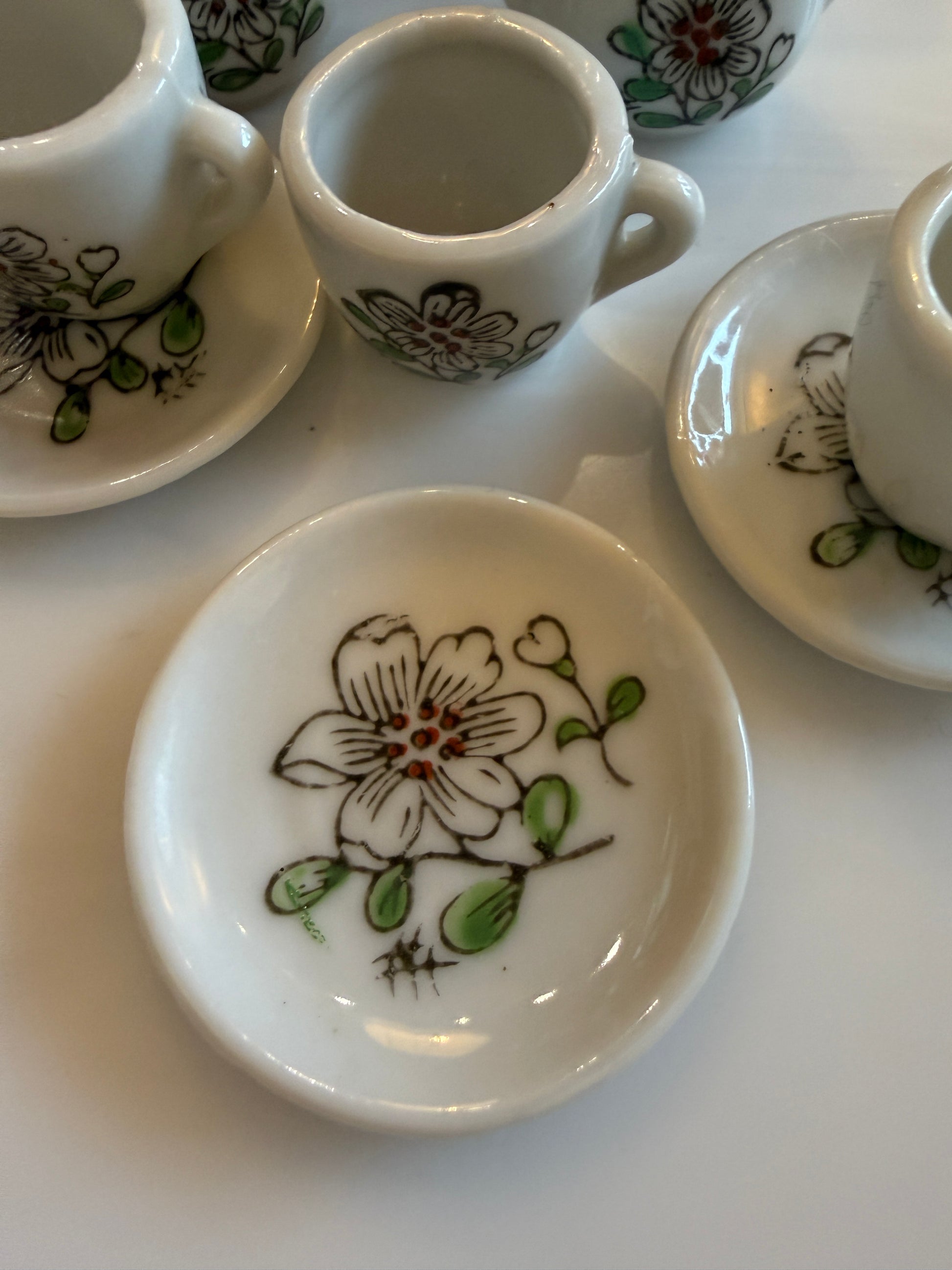 This adorable ceramic set, stamped "Made in Japan," features a classic mid-century design perfect for dollhouse enthusiasts, vintage toy collectors, or as cute shelf décor. Each piece is crafted from white ceramic and hand-decorated with a simple yet elegant brown floral outline (reminiscent of dogwood or cherry blossoms) with green leaf accents.
