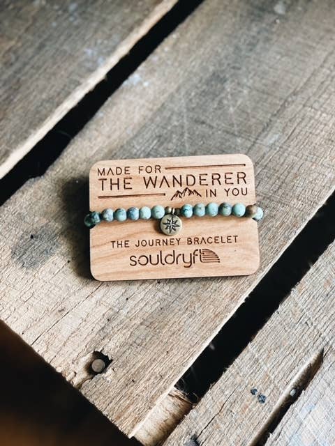 Made for the wanderer in you. This Journey Bracelet is made using semi-precious stone beads & a brass compass charm. It is featured on an engraved salvaged cherry wood card that makes for a great retail display as well as a keepsake holder for the customer. See below for the different stone meanings.