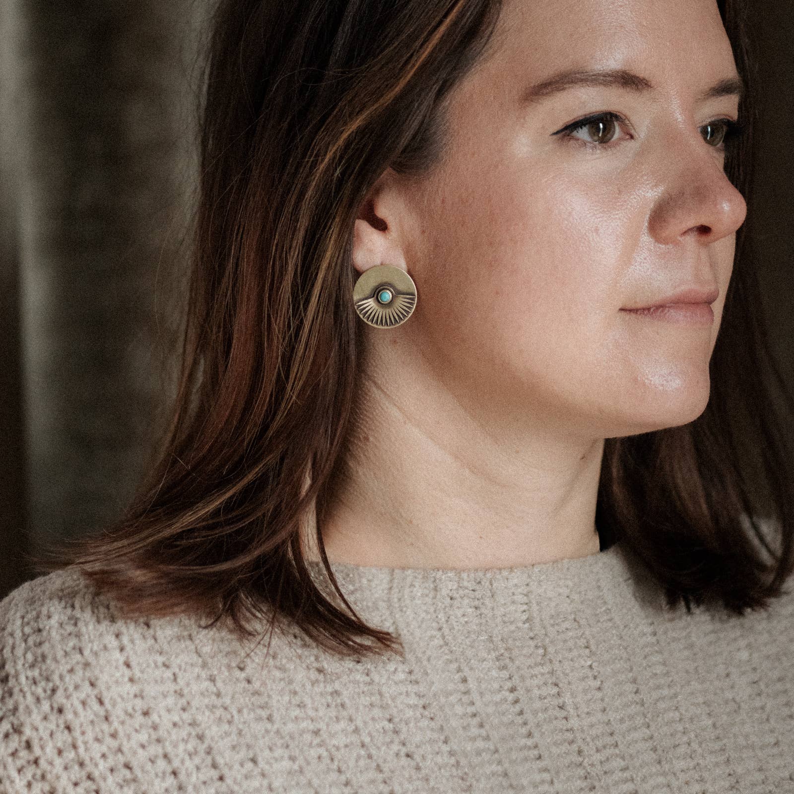 4mm bezel set turquoise pieces sit on 25mm solid brass discs with a brass detail piece and an intentional patina. All connected to sterling silver stud posts.